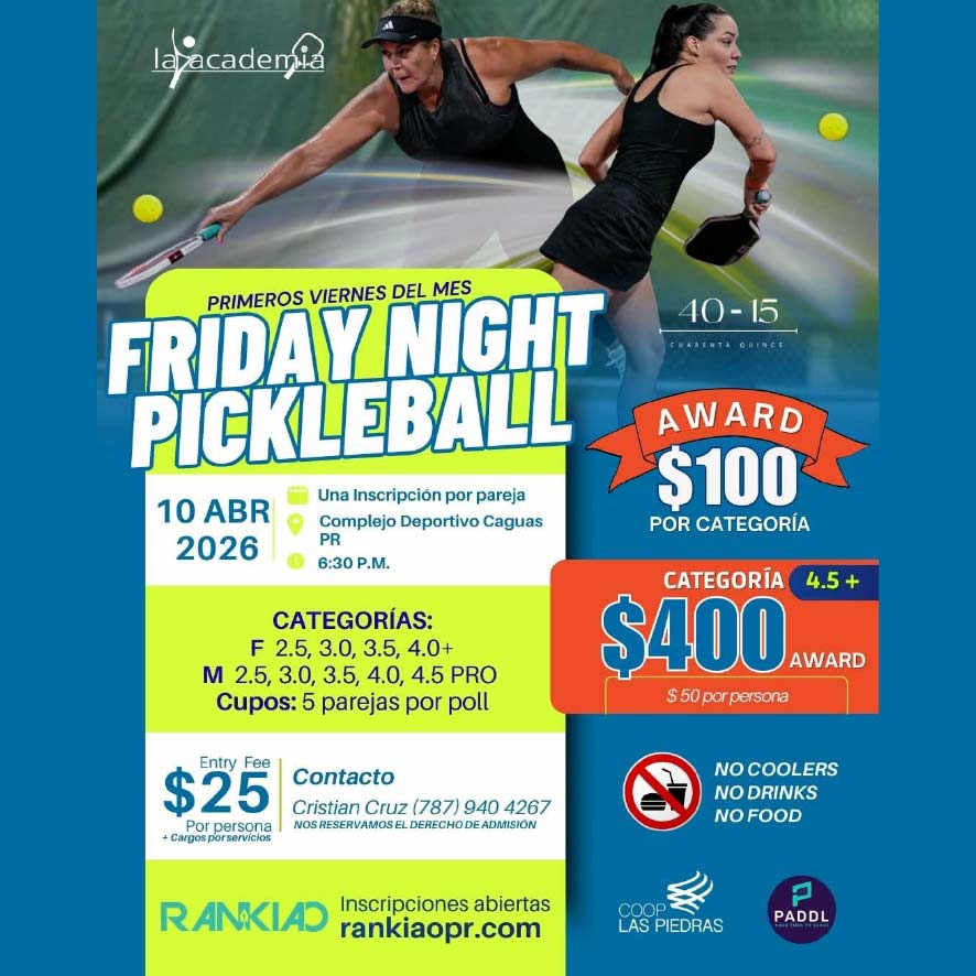 ● "La Academia Friday Night May 2026" Pickleball Tournament in Caguas, PR May 1, 2026 The complete list of Puerto Rico pickleball tournaments at www.PuertoRicoPickleballTournaments.com